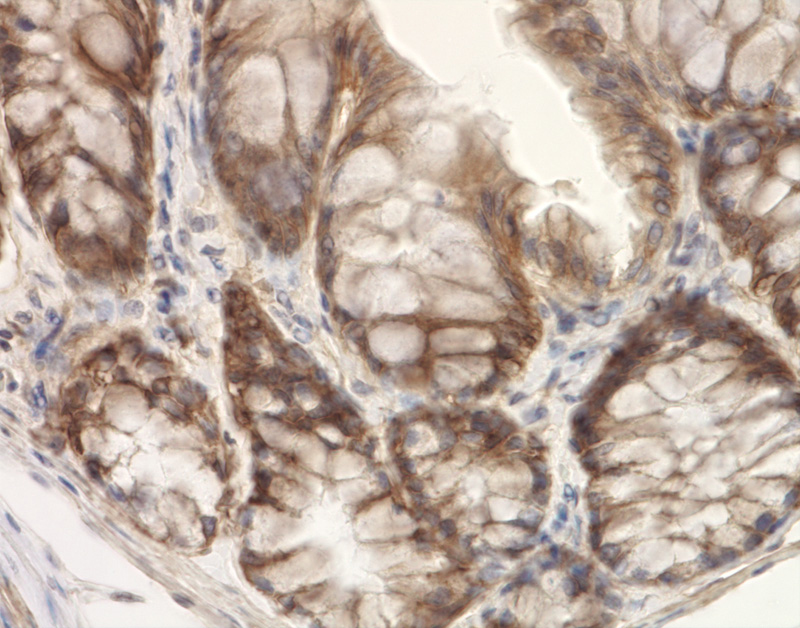 Large intestine, colon - Normal tissue. There is strong intercellular and moderate cytoplasmic labeling of colonic epithelial cells for integrin beta 1. |