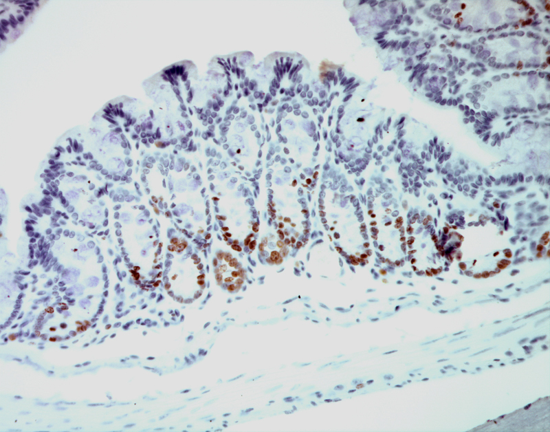 Colon - Normal tissue. There is strong diffuse nuclear labeling of the cells of colonic glands for Mki67. |