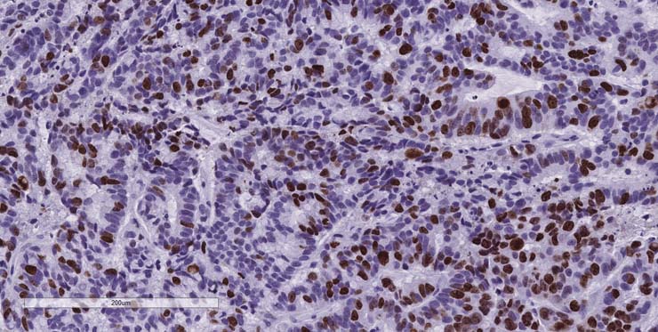 P1 tumor F147 ID010 for PDX model TM01130 stained for Ki67. Staining was positive.